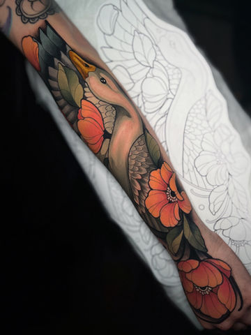 Kiki focuses her craft into the neo traditional style, using both vibrant and muted colors. Her work is often associated with her somber lady face portraits, along with plants, animals, and other trinkets.